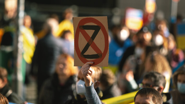 Demonstrator with a "No Z" sign outside the State Parliament, Düsseldorf, Germany, 19 March 2022. IMAGO / NurPhoto