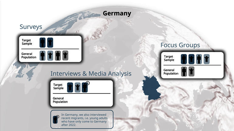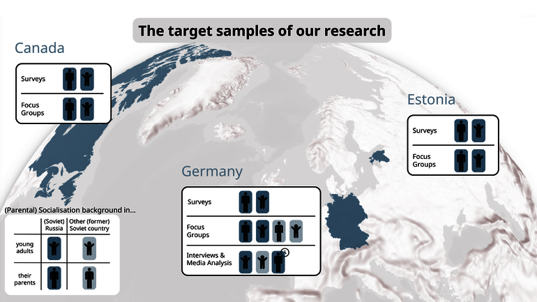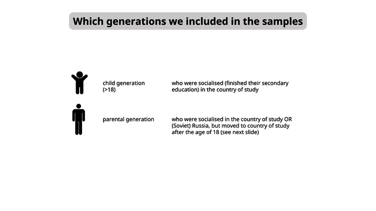 Respondents: A random share of the general population in each country and an oversampling of individuals with a (Soviet) Russian background. The surveys also include an intergenerational component, i.e., interviews with a young adult and a respective parent whenever possible. This (Soviet) Russian background is defined as follows in Germany and Canada: