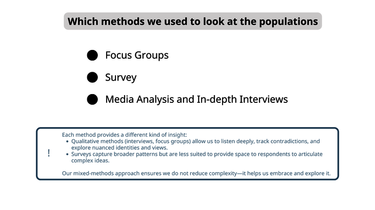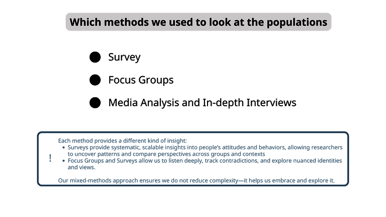 - Qualitative methods (interviews, focus groups) allow us to listen deeply, track contradictions, and explore nuanced identities and views.