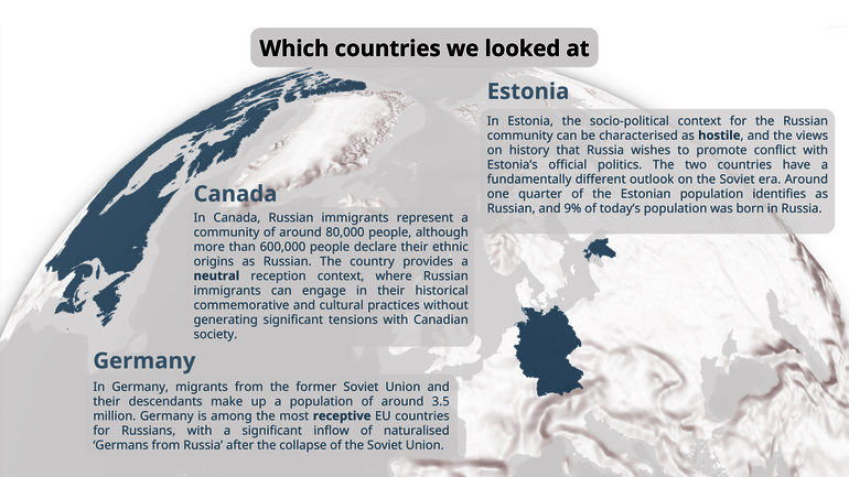 For G1, we focus on those socialised in today's Russian Federation, shaped by an authoritarian political climate, a heavily restricted media landscape but also intensive political propaganda and politics of history. For G2, identity and belonging are explored through their own narratives and reflections. These interviews help us understand how perceptions of Russia and "Russianness" evolve after migration.