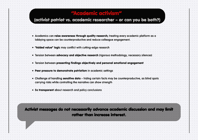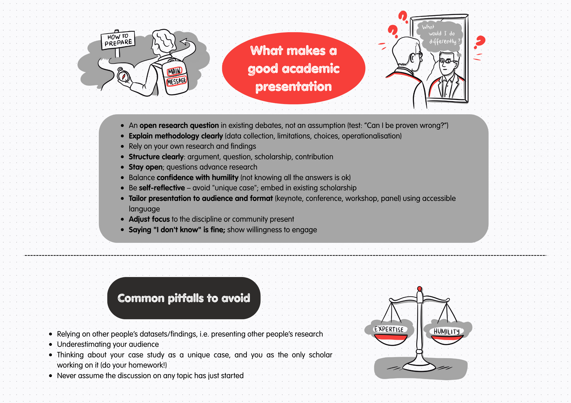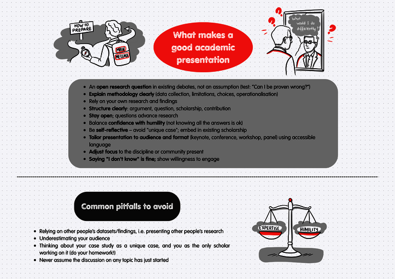 In this workshop, participants learned how to structure and deliver presentations that foster meaningful academic discussions. The session covered topics such as tailoring presentations to the target audience, framing research questions effectively, and communicating key findings clearly without overwhelming listeners with excessive detail. In particular, participants looked at differences in the ‘what’ and the ‘how’ of communicating in different roles, as an academic, a policy advisor or an activist. What are the risks of mixing these roles? And how do we mitigate them?