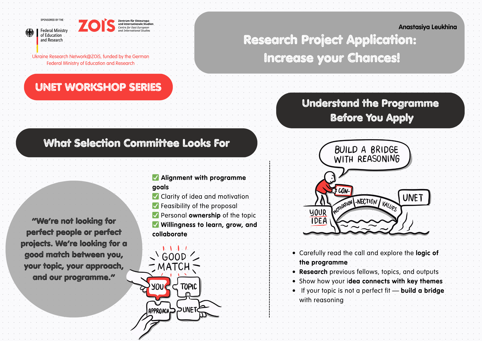 This session was designed to provide participants with a better understanding of the selection process for UNET fellows from the perspective of a selection committee member. Drawing on real examples and insights gained through reviewing applications and conducting interviews, it looked at what makes a proposal compelling or ineffective and advised candidates on how to present themselves as strong fits for a given programme. Through a combination of focused inputs, open exchange, participants gained a clearer sense of how selection panels evaluate applications, the criteria they prioritise, and common pitfalls to avoid. Rather than presenting a fixed formula for success, the session offered practical reflections intended to help participants refine their own strategies for both written applications and interviews.